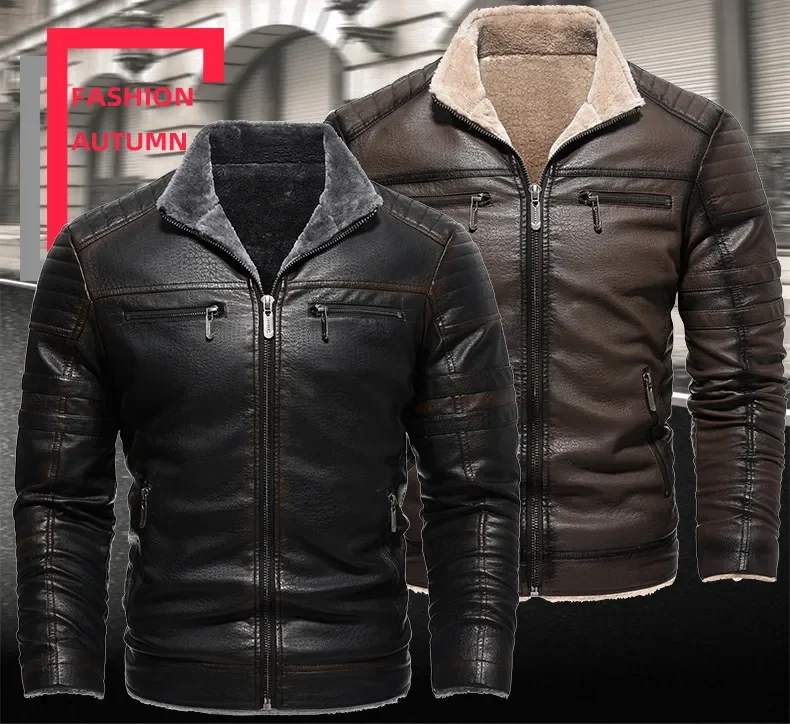 Winter Warm Fleece Men's Leather Jacket Vintage Lapel Solid Thicken Motorcycles Coat Autumn Male Windproof Jackets Outerwear